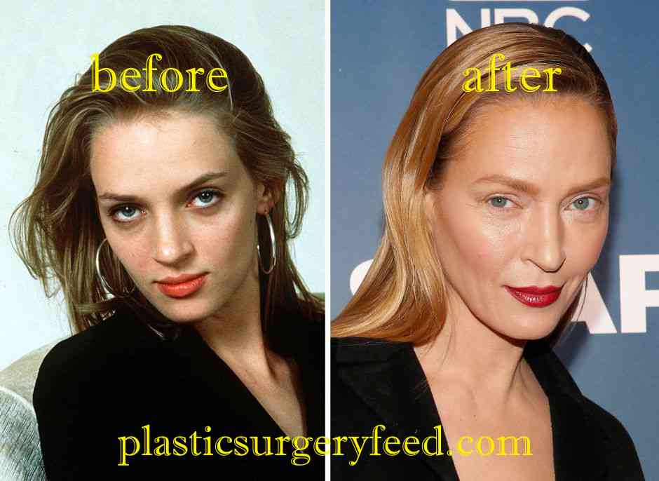 Plastic surgery is normal among celebrities in Hollywood. Breast implants and rhinoplasties are nothing new there. Check out the table below to see Uma Thurman's plastic surgery history.